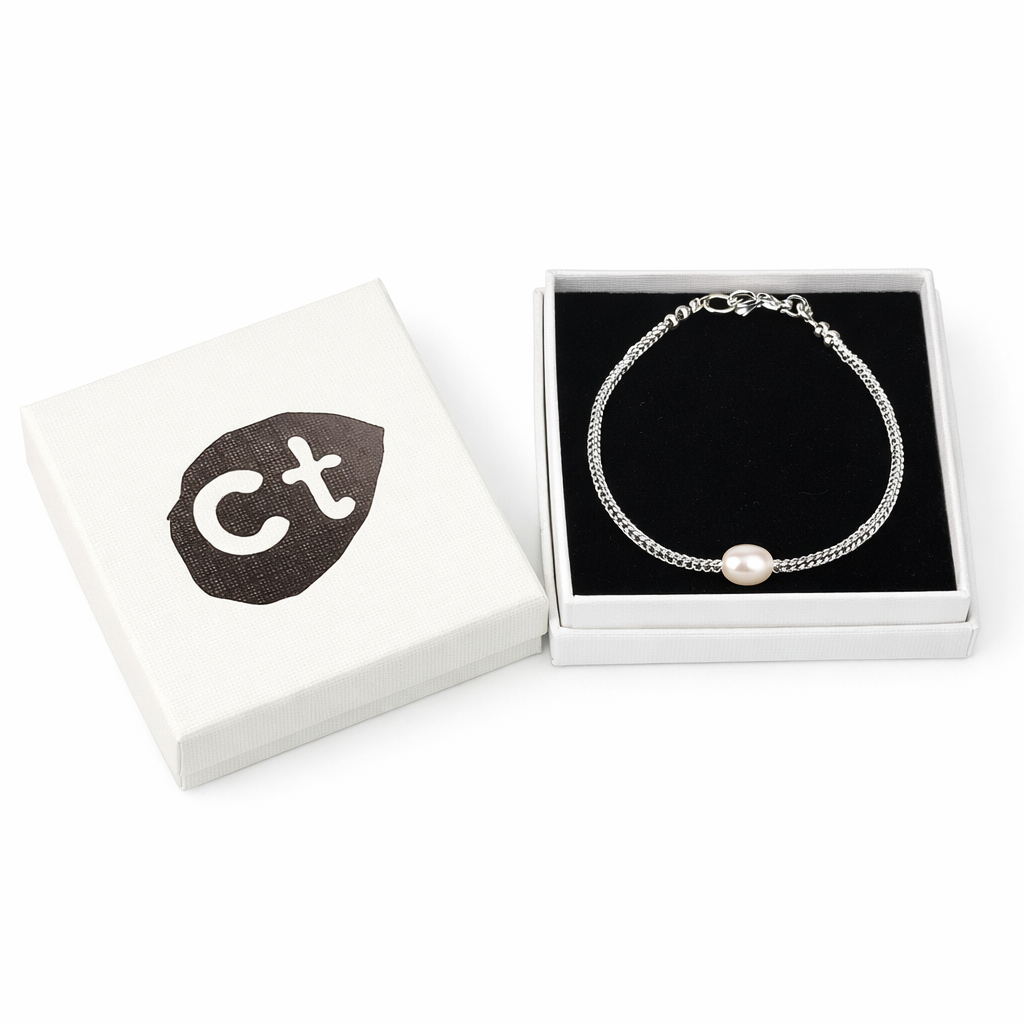 This charming bracelet features a single cultured pearl. It is crafted with care at our studio on the banks of the River Clyde. We hope you enjoy our jewellery as much as we enjoy making it. Length: 16cm